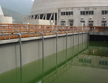 如萊蕪鋼鐵集團的污水處理池項目便選用了三合盛公司新型的噴涂聚脲防水涂料。本項目共5個污水處理池,全部采用了灰色的噴涂聚脲防水涂料進行防腐、防水處理。由于底材為模板澆注的混凝土,表面孔洞很多,因此先施工一道聚合物水泥砂漿進行找平。干燥后施工一道配套底漆,然后噴涂1.5mm的聚脲涂層。施工完后的涂層連續(xù)、無接縫,防水效果良好。